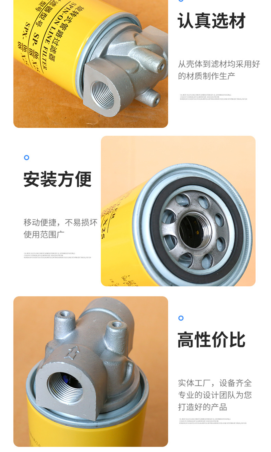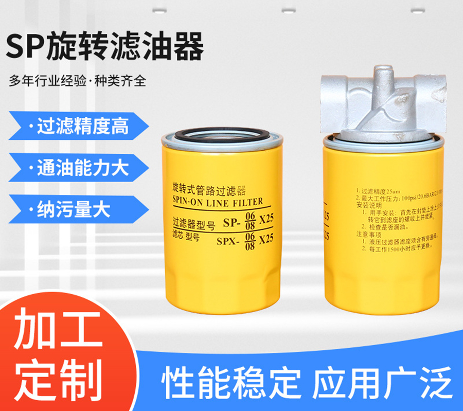 SP旋轉(zhuǎn)式管路過濾器用于液壓系統(tǒng)回油過濾或低壓供油系統(tǒng)過濾,清除油液中由于元件磨損產(chǎn)品生產(chǎn)生的金屬顆粒,以及其他雜質(zhì)等污染物。提高油液清潔度,減少元件磨損和液壓故障。 該系列的濾油器是由濾頭和濾殼(芯)兩個部份組成,濾頭采用鋁合金制造,濾殼(芯)采 用薄板鋼板整體成型 新工藝沖刺制后與紙濾芯或化纖濾芯組合成鋼殼濾芯,所以本系列濾油器具有外形美觀,重量輕,堵塞時只需更換鋼殼濾芯等優(yōu)點。